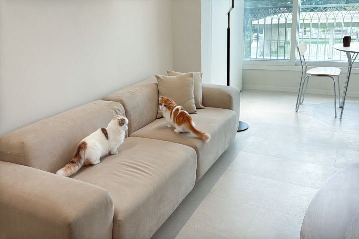 거실과 안방에서 고양이들과 함께 시간을 가장 많이 보냅니다. 인테리어 이후 두 공간이 편안하고 아늑해져 자연스럽게 머무는 시간이 늘었고 루나, 루비와 함께하기에도 한결 좋아졌습니다.