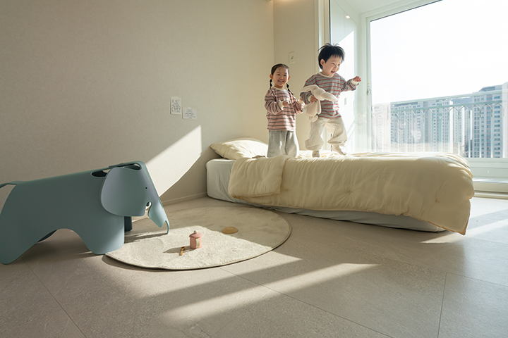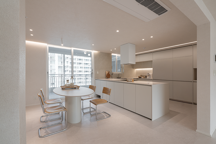 아이들이 아직 어려 바닥재의 내구성과 안전성을 중요하게 생각했습니다. 충격과 오염에 강하고 미끄럼 방지 기능까지 갖춘 제품을 찾았고, 상담을 통해 LX Z:IN 바닥재 에디톤 스톤을 선택했습니다. 관리가 쉽고 아이들에게 안전한 환경을 마련해 준 점이 만족스럽습니다. 기존 식탁을 등지고 있던 조리대 위치를 변경해 대면형 주방으로 구성했습니다. 가족과 마주 보며 소통할 수 있도록 구조를 바꾼 점도 의미 있는 변화였습니다.