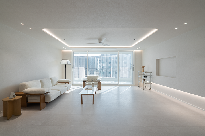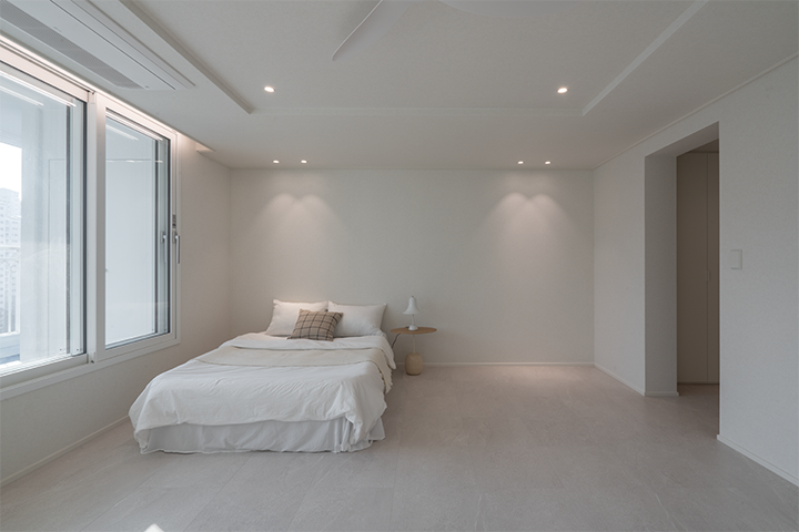 거실에서 가장 많은 시간을 보냅니다. 아이들과 함께 책을 읽고, 남편과 이야기를 나누며 하루를 마무리하는 장소이기 때문입니다. 보다 편안한 분위기를 만들기 위해 우물천장을 시공해 층고를 높였고, 회벽 질감의 벽지를 적용해 차분하고 머물고 싶은 공간을 완성했습니다.