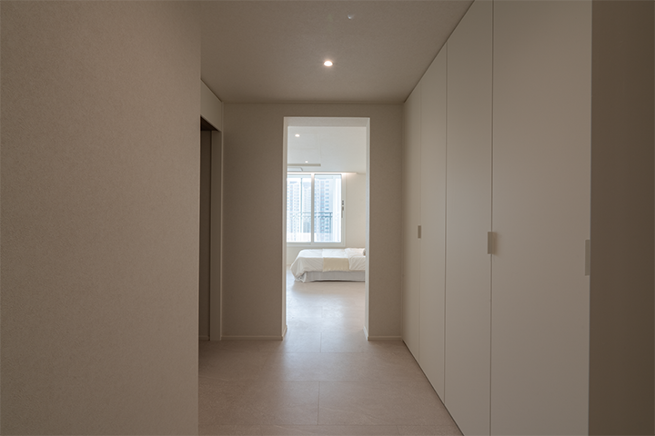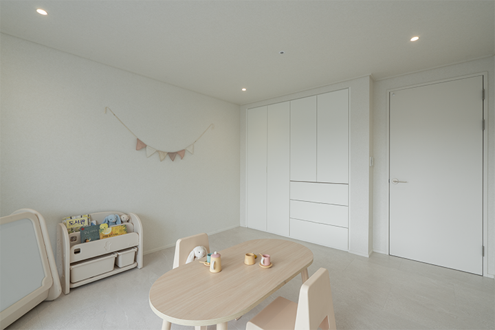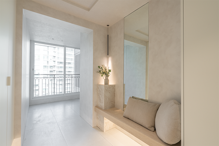 아이들 장난감과 살림살이가 많아 공간이 최대한 간결하고 넓어 보이도록 구성하는 데 초점을 두었습니다. 침실에는 붙박이장을 설치해 수납 효율을 높였고, 전체적으로 그레이 컬러의 마감재를 톤온톤으로 매치해 모던하면서도 차분한 분위기를 완성했습니다. 현관에는 벤치를 마련해 아이들 신발을 신기기 편하도록 배려한 점도 만족스럽습니다.