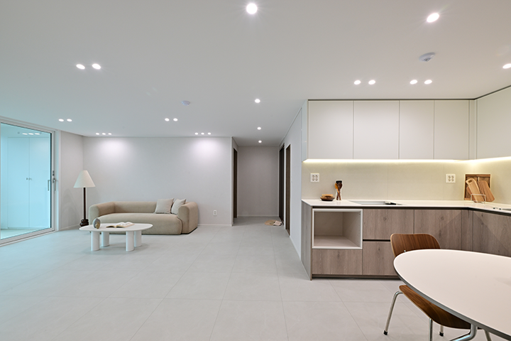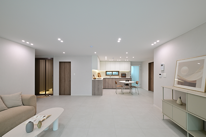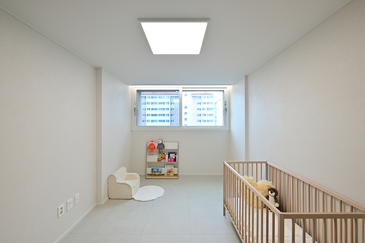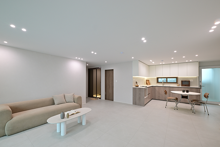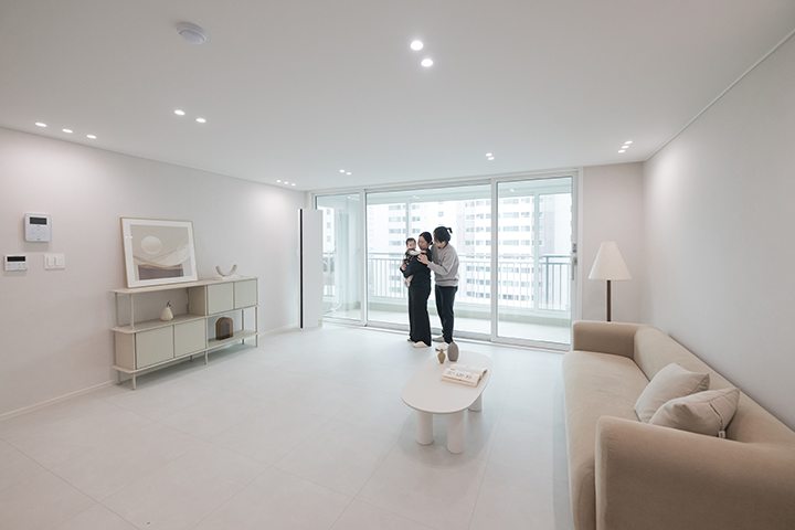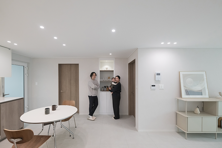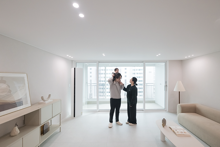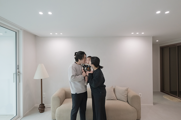 아이가 마음껏 뛰어놀기 좋은 거실에서 주로 생활합니다. 낮에는 햇살 가득한 공간에서 아이와 장난감 놀이를 하거나 책을 읽으며 활기찬 일상을 함께하고, 아이가 잠든 저녁에는 은은한 조명이 더해진 아늑한 분위기 속에서 부부만의 대화를 나누며 오붓하게 하루를 마무리합니다.