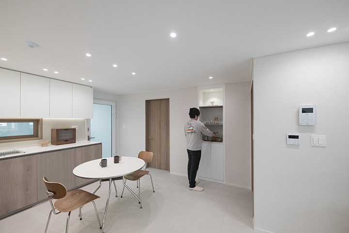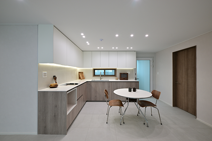 아이와 함께하는 공간이다 보니 원래도 위생에 신경을 많이 썼는데, 밝은 톤의 바닥재로 교체하니 머리카락이나 먼지가 눈에 잘 띄어 전보다 더 부지런히 청소하게 되었습니다. 무엇보다 집이 화사하게 바뀌니 매 순간이 행복합니다. 전에는 조리대가 낮아 남편이 허리 통증을 겪기도 했지만, 높이를 개선한 후에는 남편도 불편함 없이 주방을 이용할 수 있게 되어 무척 마음에 들어 합니다.