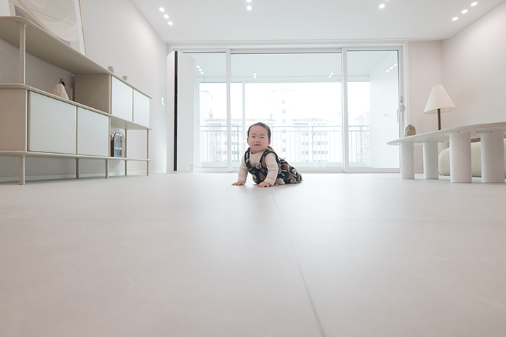 아이가 기어 다니고 곧 걷게 될 시기라 바닥재 선택을 가장 중요하게 생각했습니다. 그래서 2중 쿠션층이 특징인 LX Z:IN 바닥재 엑스컴포트 5.0을 시공했는데, 도톰한 쿠션감으로 아이가 넘어져도 안심할 수 있어 만족합니다. 사실 장판은 디자인이 투박할 거라는 편견 때문에 고민이 많았지만, 세련된 디자인을 보는 순간 그런 걱정이 사라졌습니다. 기능과 디자인을 모두 갖춘 제품이라 주저 없이 선택하게 되었습니다.